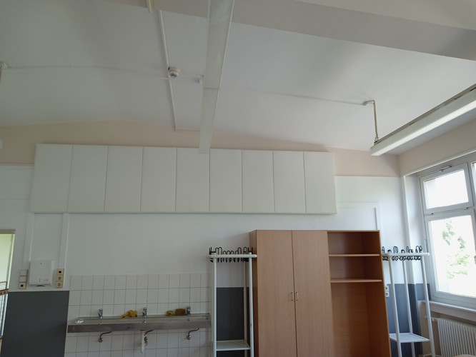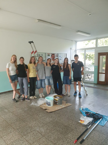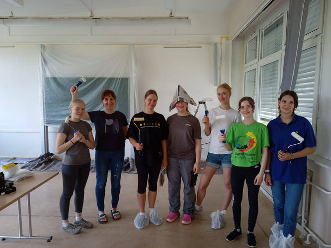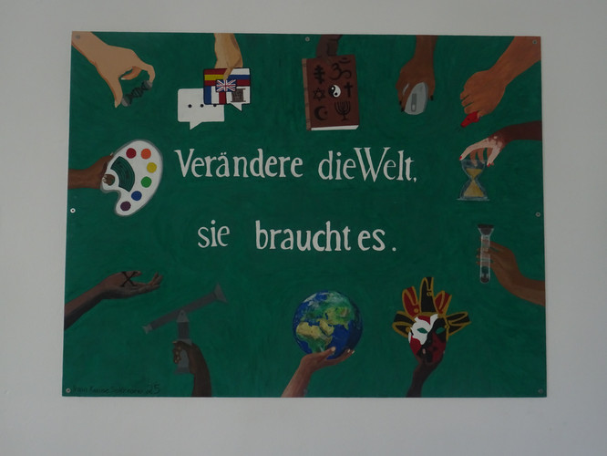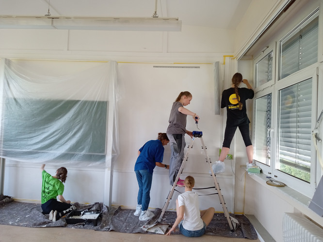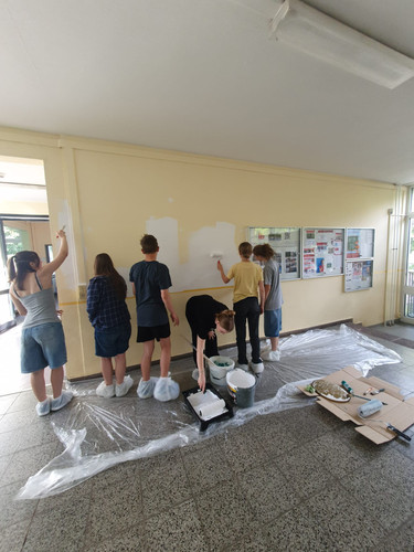 Im Rahmen des Profilunterrichts „Lernen durch Engagement“ hatte in paar Wochen zuvor bereits eine Gruppe von Schülerinnen und Schülern die Wand der Mädchentoilette im Erdgeschoss des Hauptgebäudes frisch gestrichen.