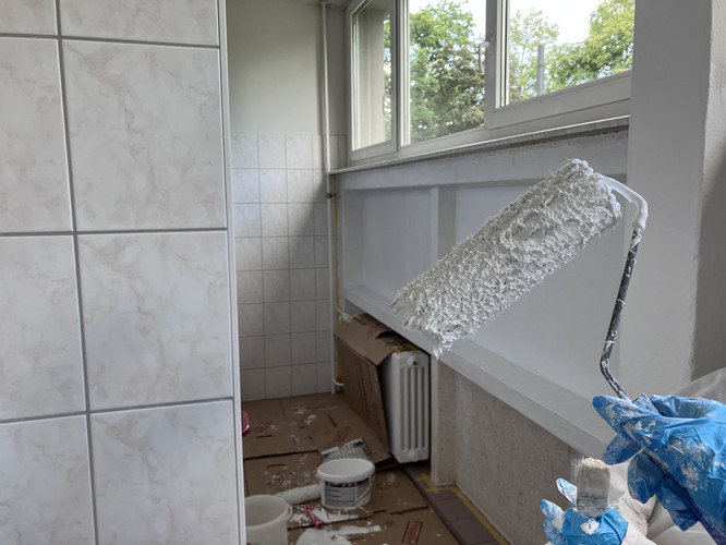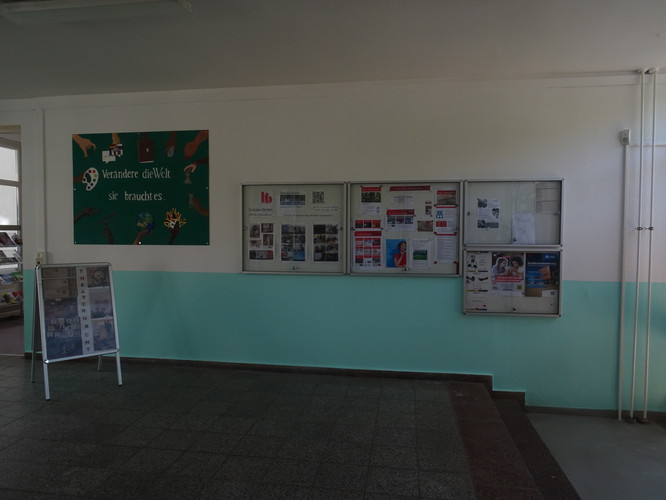 Angesichts unseres sich nun doch länger hinziehenden Aufenthalts am Auslagerungsstandort, der überdies auch mehr und mehr in die Jahre kommt, hatte die Fördergemeinschaft für den 24.06.2025 zu Malerarbeiten im Hauptgebäude aufgerufen. Eine Gruppe von Eltern und Schülerinnen und Schülern sowie Frau Franke führten diese Malerarbeiten im Foyer des Hauptgebäudes und im Raum H217 durch und verhalfen diesen Räumen zu neuer Frische. Ein Leitspruch Bertolt Brechts ziert nun überdies als Wandbild das Foyer und begrüßt Gäste, Schülerinnen und Schüler, Eltern und Lehrkräfte beim Betreten des Gebäudes.
