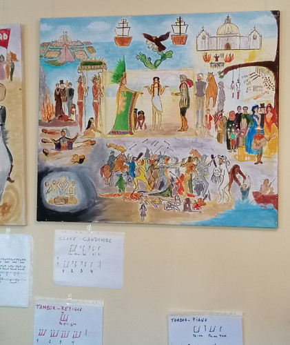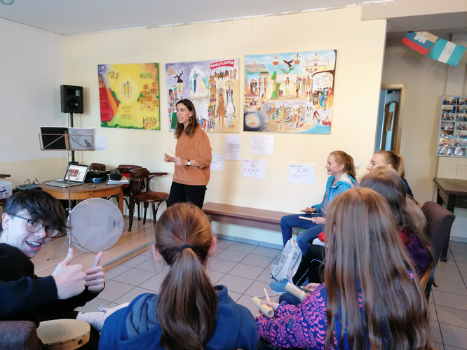 Gut gestärkt ging es weiter zur Asociación Intercultural Iberoamericana, wo wir an einem Rhythmus-Workshop teilnahmen. Dort lernten wir etwas über die verschiedenen Rhythmen typisch lateinamerikanischer Musik. Außerdem bekamen wir Instrumente wie Klanghölzer, die zu den typisch lateinamerikanischen Rhythmusinstrumenten zählen, und musizierten selbst mit. Leider gab es hier nicht wirklich viele Möglichkeiten, Spanisch zu sprechen.
