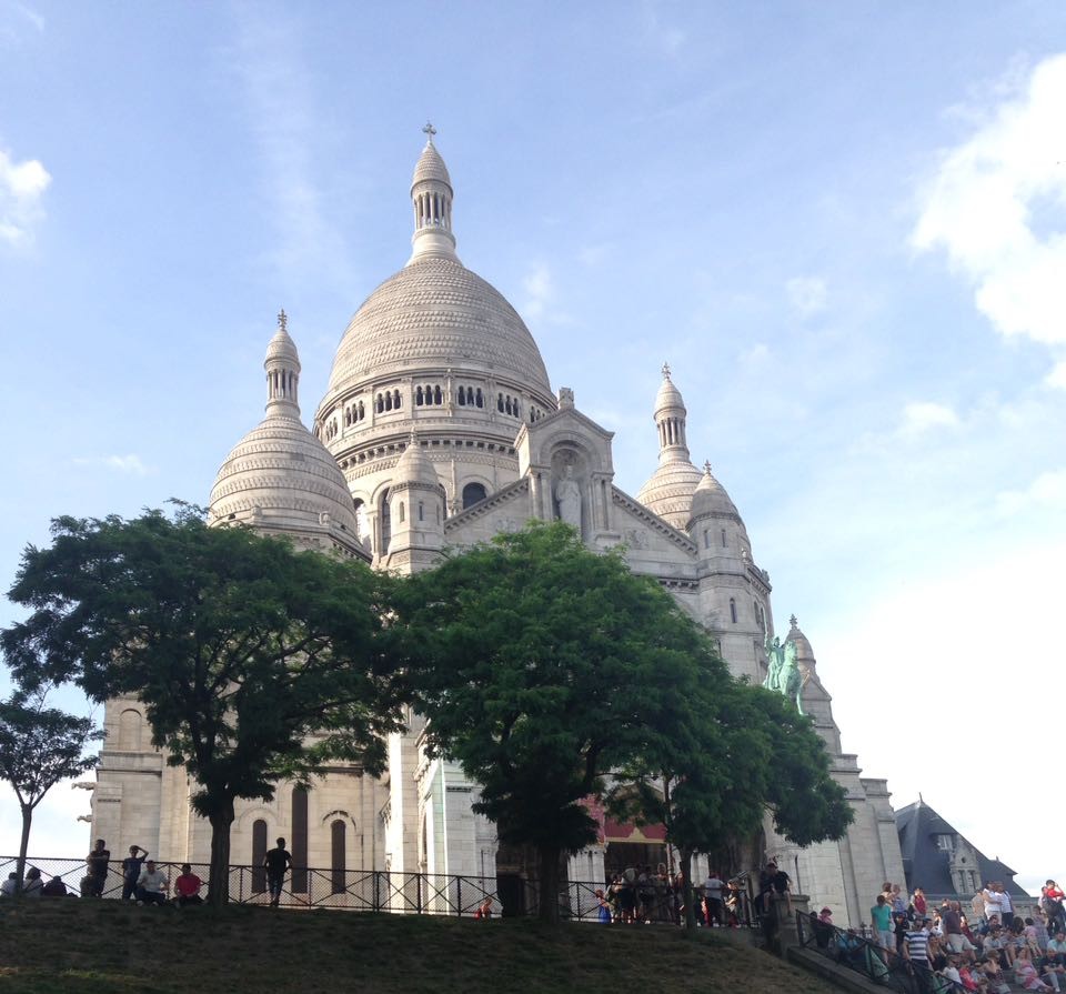 Nachdem wir uns dann endlich in die Zimmer eingenistet hatten, trafen wir uns an der Rezeption, bereit zum Aufbruch. Mit der Metro fuhren wir nach Montmatre, um den Aufstieg vorbei am Moulin Rouge zur Basilika Sacré Coeur. An der Basilika bekamen wir bis 20 Uhr Zeit, damit wir sowohl die schöne Gegend samt Aussicht auf Paris als auch die Basilika bewundern und uns etwas zum Essen besorgen konnten. Danach fuhren wir gemeinsam wieder zurück zum Hotel, da wir nun langsam unsere Betten aufsuchen sollten.