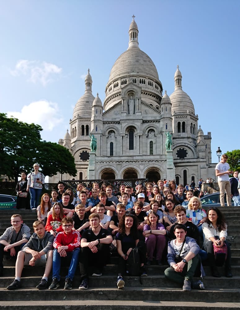 Unsere Studienfahrt begann Sonntagabend. Vollbepackt trafen wir gegen 21.30 Uhr neben der Turnhalle auf der Thomaestraße ein. Schnell wurde über die Sitzplätze im Bus entschieden, dann verabschiedeten sich alle von ihren Angehörigen und wir verließen Dresden in Richtung Paris. Auch wenn wir mit einem sehr modernen Reisebus fuhren und der Busfahrer regelmäßig Pausen einrichtete, waren alle froh, als wir endlich nach einer langen Nachtfahrt Montagmittag vor dem Hotel stoppten. Da bei der Ankunft gegen 12 Uhr noch nicht alle Zimmer bereit waren, verteilten wir unsere Koffer zunächst auf zwei Zimmer und hatten bis 15 Uhr Freizeit, um im „Auchan“, einem Einkaufszentrum, Proviant für die kommenden Tage zu besorgen. Danach konnten wir endlich die Zimmer beziehen. Sie waren klein, für drei Personen eingerichtet und verfügten jeweils über ein eigenes Badezimmer. Zunächst machte es sich jeder erst einmal gemütlich. Gegen 16.30 Uhr führte uns Herr Lindner zur Metro und wir fuhren beengt, aber schnell bis zum Moulin Rouge, dem wohl bekanntesten und ältesten Varieté der Welt. Nach einem kurzen Fotostopp begannen wir den mühsamen Aufstieg nach Montmartre. Auf dem Weg sahen wir den Drehort von „Die fabelhafte Welt der Amélie“ und einen kleinen Park. Oben angekommen beobachteten wir eine Weile eine probende Schauspielgruppe und versammelten uns dann auf den Treppen der Kirche Sacré-Cœur für ein schönes Gruppenfoto. Im Anschluss hatten wir Freizeit, um das Viertel zu erkunden, und zum Abendessen. In kleinen Gruppen besichtigten wir die wirklich atemberaubend schöne Kirche, kauften hübsche Souvenirs und aßen lokale Köstlichkeiten, die an so einem Ort allerdings etwas teuer waren. Satt und zufrieden trafen sich alle gegen 21 Uhr wieder und wir begannen den Abstieg und die Heimfahrt Richtung Hotel. Nach der langen Busfahrt und dem zwar zauberhaften, aber dennoch anstrengenden Aufenthalt in Montmartre waren die meisten froh, dass ein weiches Bett auf sie wartete.
