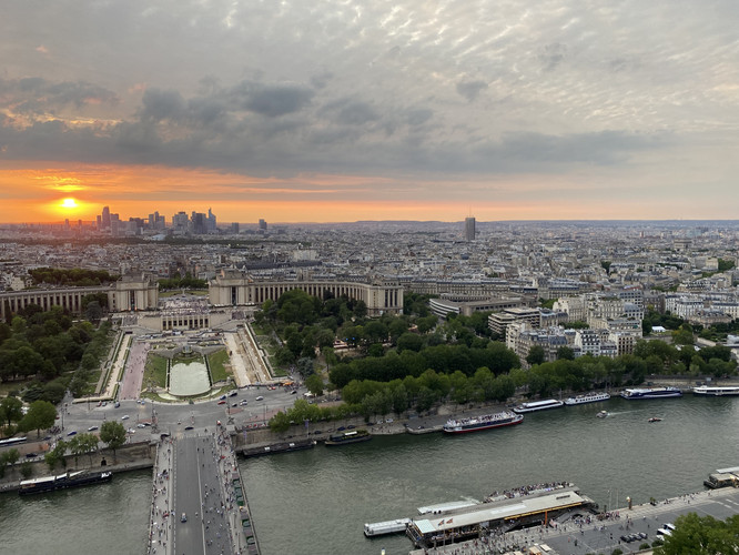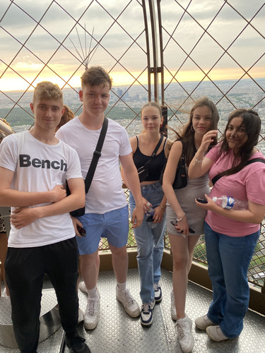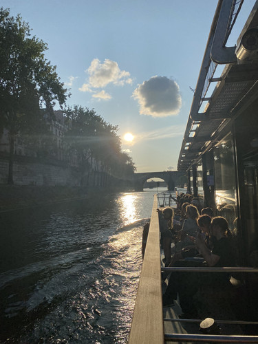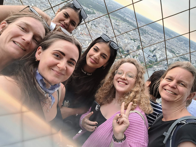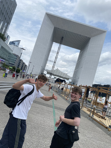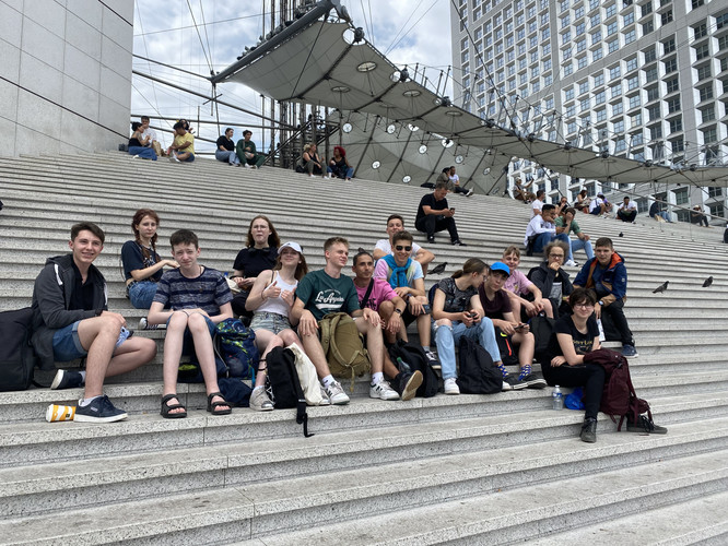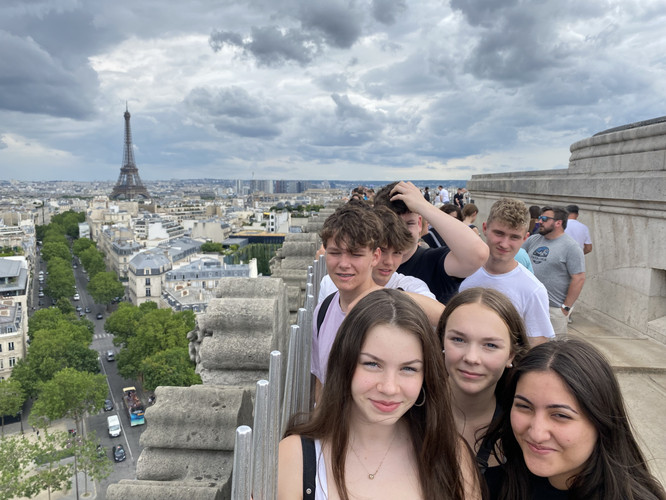 Am Morgen des 20. Juni 2023 verließen wir Paris in Richtung Versailles, um das Schloss und die Gärten der französischen Könige zu besichtigen. Natürlich durchquerten wir auch den weltberühmten Spiegelsaal, der allen aus dem Geschichtsunterricht schon bestens bekannt war. In Versailles gab es auch ein weiteres Wiedersehen, diesmal mit Schülerinnen unserer französischen Austauschschule aus Asnières-sur-Seine, welche erst im April bei uns zu Gast waren. Am frühen Nachmittag fuhren wir zurück nach Paris ins Viertel La Défense, welches aufgrund seiner modernen Architektur und vielen Hochhäuser auch als das Pariser Manhattan bezeichnet wurde. Nach einer ausgiebigen Mittagspause fuhren wir mit der Metro zum Triumphbogen, der das westliche Ende der weltberühmten Champs-Elysées bildet. Nach dem Aufstieg über eine scheinbar nie enden wollende Wendeltreppe erreichten wir die Aussichtsplattform des Arc de Triomphe und wurden mit einem tollen Ausblick belohnt. Im Anschluss hatten alle Zeit, die Champs-Elysées auf eigene Faust zu erkunden, bevor wir bei einer Bootsfahrt auf der Seine Paris vom Wasser aus kennenlernten. Zum Tagesabschluss begaben wir uns auf eine Anhöhe gegenüber des Eiffelturms und sahen ihn in der Dunkelheit strahlen und glitzern.