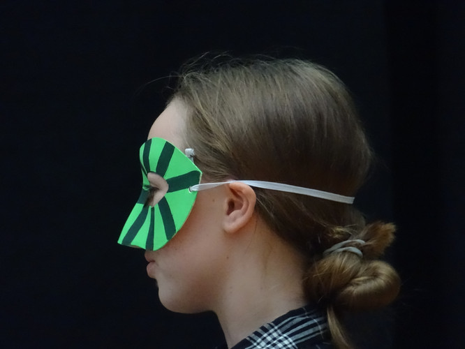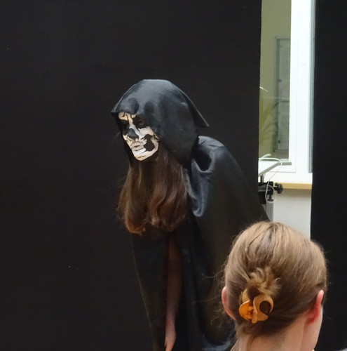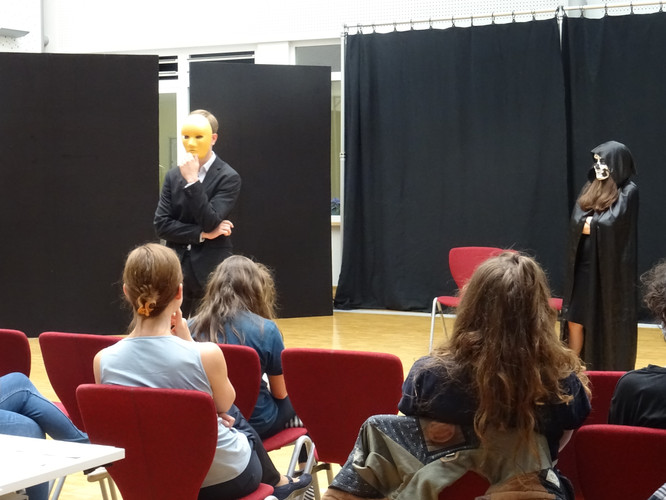 Nach der Begrüßung durch Frau Folprecht begann der Abend und die Vorfreude des Publikums stieg. Alle Schauspieler und Schüler hinter der Bühne erhofften sich eine fehlerfreie Aufführung ohne Probleme. Der Abend begann mit „Informer“, darauf folgte das Stück der Theater-AG. Schüler von der fünften bis zur achten Klasse begeisterten das Publikum. Ganz großen Applaus! Die zweite Hälfte des Abends begann mit einer zweiten Interpretation von „Informer“, darauf folgte das Stück „Salzburg – Dance of Death“.