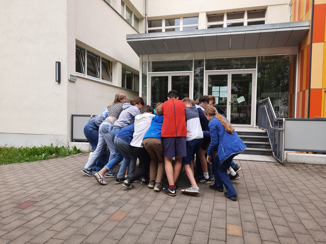 Im Rahmen eines Klassensommerfests führte die 7/4 am 22. Juli ihre Präsentation zu Fontanes „John Maynard“ auf. Als Theatercollage gestaltet, war die Klasse im Voraus eigenständig kreativ geworden und dichtete die Ballade kurzerhand weiter, indem die Schülerinnen und Schüler ihre Interpretationen zur letzten Fahrt der „Schwalbe“ verfassten. Damit sie sogar Theodor Fontane höchstpersönlich Konkurrenz machen! In einem vierwöchigen Theaterprojekt, welches zwischenzeitlich von Quarantäne und Klassenfahrt geprägt war, erhielten die Schülerinnen und Schüler nicht nur erste Einblicke in die theatralische Spielpraxis, sondern erwiesen sich nach nur kürzester Zeit als Vollblutschauspielende, indem sie am heutigen Donnerstag Eltern, Großeltern, Lehrkräfte und Freunde von ihrem Talent begeistern konnten: Ob in Gebärdensprache, Englisch, Spanisch oder doch Deutsch, ob im Solo, Duo oder Chor, ob in rennender Zeitlupe, wabernden Feuerflammen oder berstenden Schiffsbalken – die 7/4 zeigte allen Zuschauerinnen und Zuschauern, dass die Ballade nicht nur zum trockenen Auswendiglernen taugt, sondern körperlich, stimmlich und in kräftigen Emotionen theatralisch visualisiert werden kann.