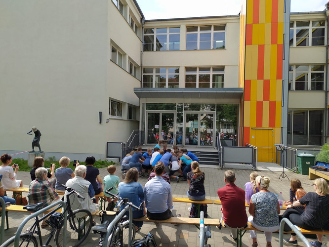Alle Herzen sind froh, alle Herzen sind frei, da klingt’s aus dem Schulhof her wie Theaterei – „John Maynard“ war es, was da klang, die Klasse 7/4 Jubel und Beifall gewann.