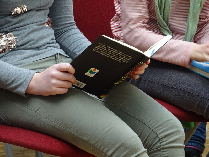 Die zwei besten Vorleser jeder Klasse traten aufeinander folgend gegeneinander an, im ersten Teil mit einer Passage aus einem selbst gewählten Buch, im zweiten Teil beim Vorlesen eines unbekannten Textes, das unser Bibliothekar Herr Eichler ausgewählt hatte. Und das alles in einer vollen Aula vor den Augen aller Klassenkameraden! Das war für die Kandidaten sicher erst einmal wenig besinnlich. Die Jury, bestehend aus den Deutschlehrern der 6. Klasse, der Vorjahressiegerin Jette Fahry und Herrn Eichler, beurteilte die Leseleistungen und legte am Ende die drei Besten fest: