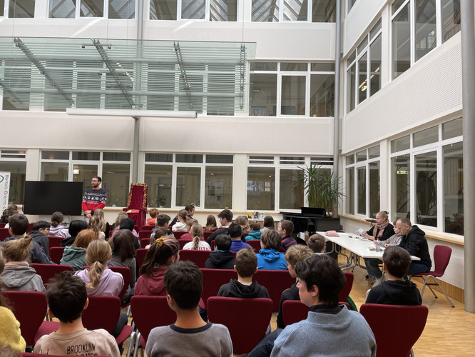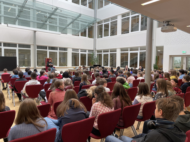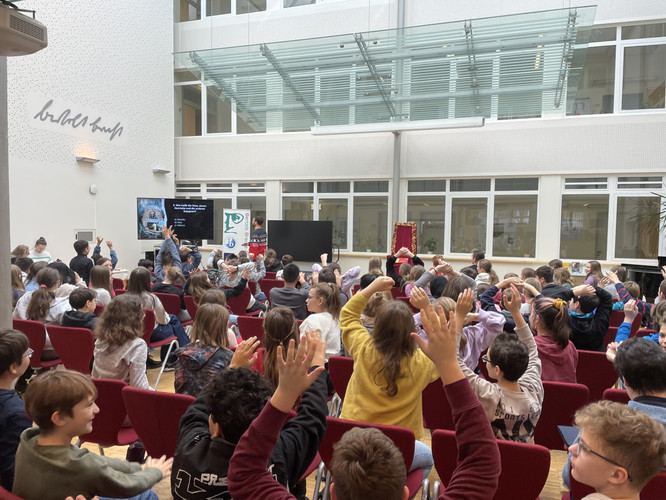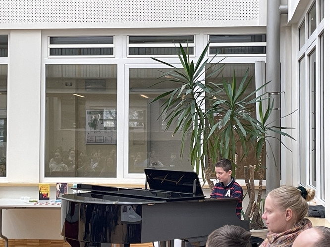 Zwischendurch gab es noch einige musikalische Beiträge am Klavier und Fakten über Bücher und zum Thema Lesen. Auch die Fragen zum unbekannten Buch konnten von den Klassen, welche ihre Kandidaten lautstark unterstützten, gut beantwortet werden.