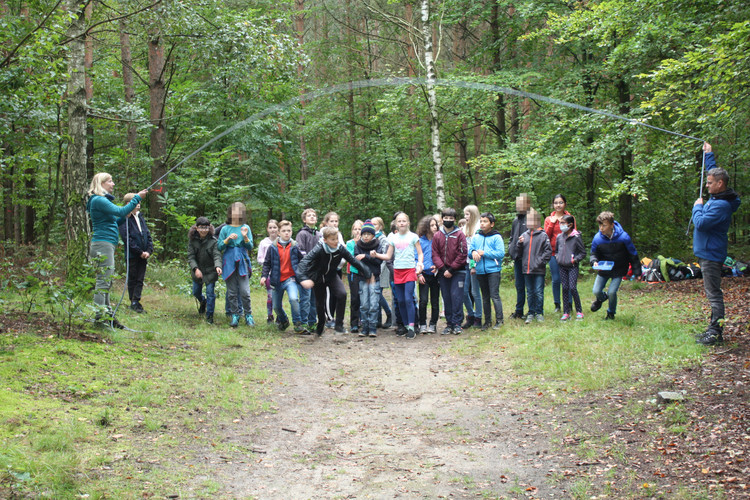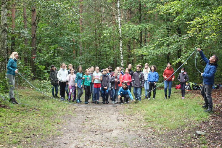 Mit der Buslinie 64 fuhren wir bis zur Waldschlösschenbrücke und stiegen dort in die Linie EV11 um. An der Mordgrundbrücke ging es dann in die Heide. Wir wanderten an einer Aussicht vorbei, wo wir ein schönes Gruppenbild machten. Nach ungefähr 45 Minuten haben wir eine Frühstückspause eingelegt. Am Ende der Pause spielten wir „Das schnellste Namensspiel der Welt“. Dann ging es weiter. An einem großen Weg legten wir eine Spielpause ein, bei der wir durch ein geschwungenes Seil laufen mussten. Dann wanderten wir weiter, einen ganz kleinen Hügel hoch und wieder runter. In der Nähe von einem Kindergarten machten wir die Mittagspause. Viele spielten Steh-Geh. Wir trafen uns noch zu einer letzten Spielrunde. Das Spiel hieß „Das stumme Labyrinth“. Da mussten wir die ganze Zeit leise sein und rausbekommen, in welche Quadrate wir treten dürfen. Dann ging es auf den Rückweg zum Weißen Hirsch. Von dort aus fuhren wir mit dem Bus zurück zur Schule.
