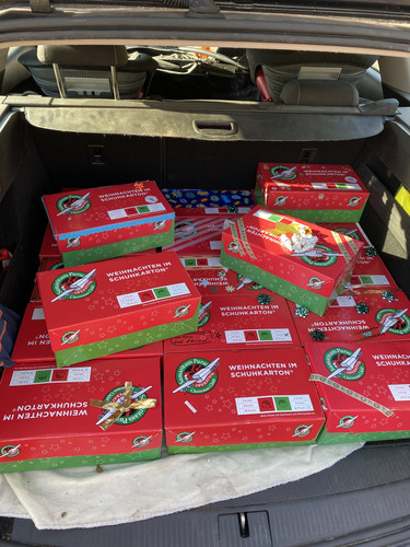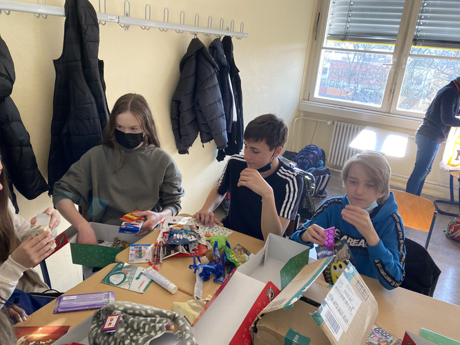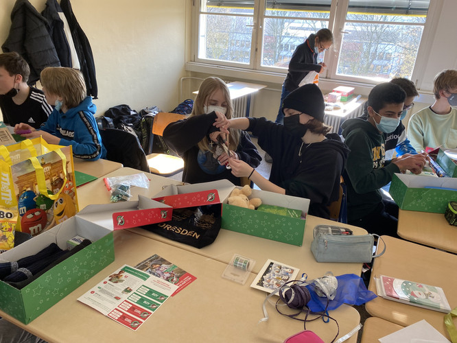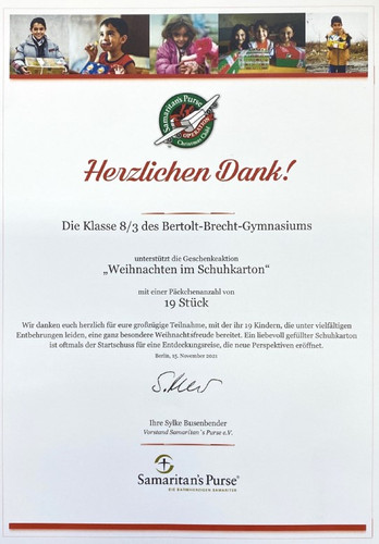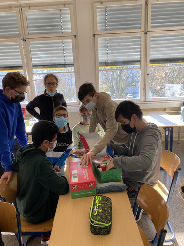 Um sich an die ursprüngliche Intention des christlichen Festes anzunähern, entschloss sich die Klasse 8/3 in diesem Jahr fast einstimmig zur Teilnahme an dem gemeinnützigen Projekt „Weihnachten im Schuhkarton“ des Samaritan‘s Purse e.V. und beschaffte somit, sich nach den Empfehlungen der karitativen Organisation richtend, Geschenke für die Kartons. Teilweise bildeten sich Gruppen zum gemeinsamen Befüllen der Pakete. Bei einer von der Klasse bestrittenen Packparty wurden somit 19 Boxen gestaltet, teilweise mit einer Nachricht versehen und verpackt, im Anschluss verladen und von unserer Klassenlehrerin, Fr. Waibl, zur Annahmestelle am Fetscherplatz überführt. Als Ausdruck der Dankbarkeit erstellte der Verein eine Urkunde, die sich an die gesamte Klasse richtet.