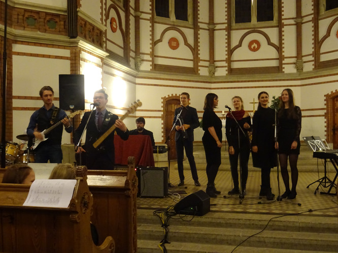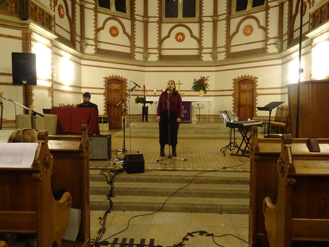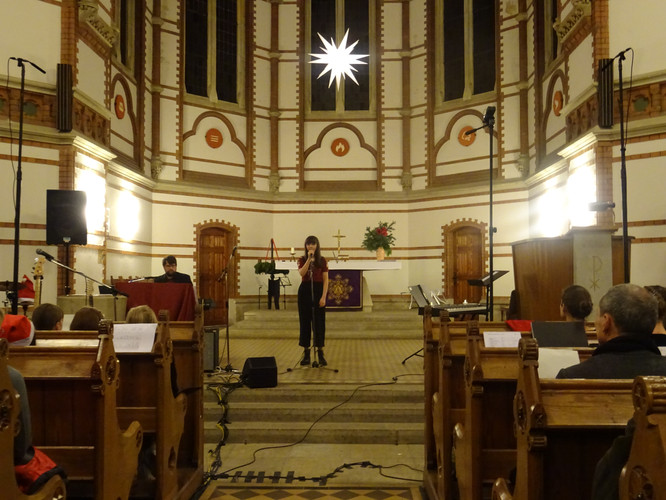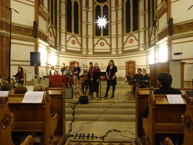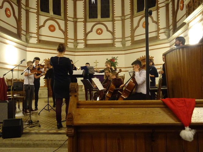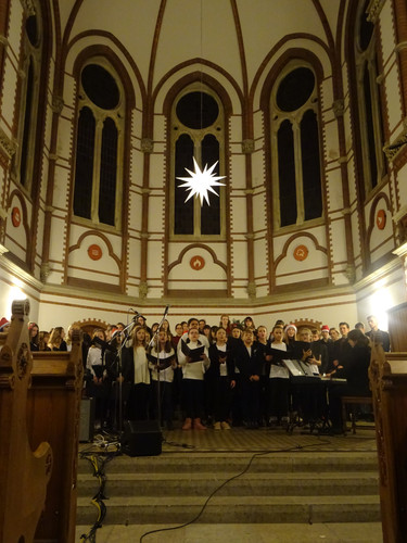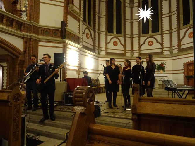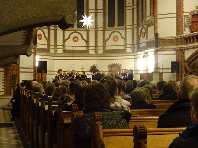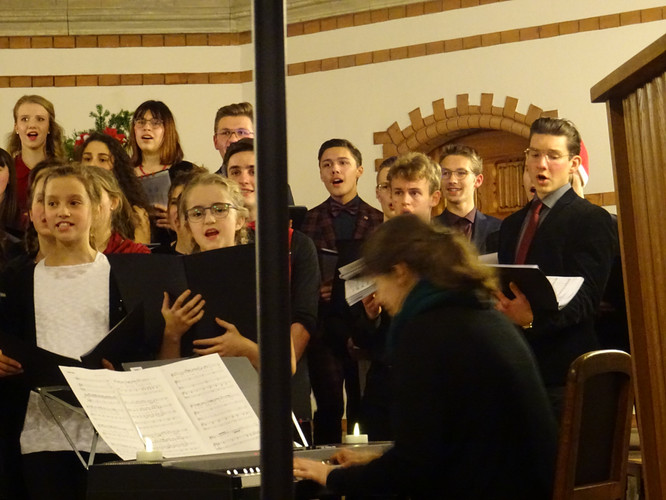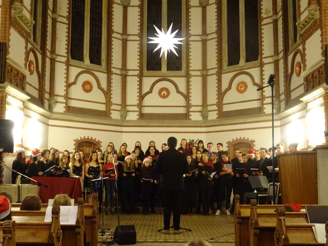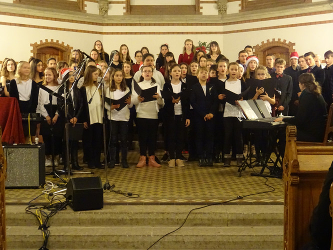 Eingeläutet wurde das Konzert von den Glocken der Heilig-Geist-Kirche – ein ungeplanter, aber effektvoller Moment. Der Wirkung des Eröffnungsstücks „Machet die Tore weit“ tat es keinen Abbruch. Im Anschluss erlebten die Zuschauer in knapp zwei Stunden ein Konzert, in dem die Zeit stehen blieb, man nicht auf die Uhr sah und das ein großes Spektrum an Stimmungen enthielt und hervorrief: Freude über viele junge Talente im Gesang und am Instrument, über die Schülerinnen und Schüler des Nachwuchschores, deren Augen strahlend auf ihre Chorleiterinnen gerichtet waren, über den ausgewogenen Klang des „großen“ Chores, Gänsehaut bei den gemeinsamen Stücken der Chöre und des Instrumentalensembles, ein Hauch von Melancholie während des Gesangs von Jasmin und Jana, Bewunderung für eigens durch Schüler einstudierte und geleitete Stücke, Schmunzeln und wippende Füße bei den Beiträgen der Band.