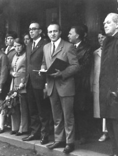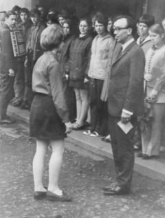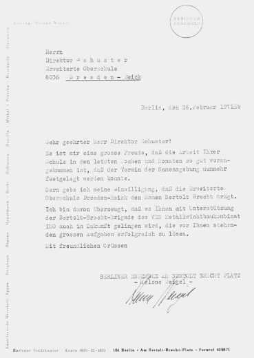 Am 5. Oktober 1970 kam es zum ersten Kontakt zwischen der Klasse und Helene Weigel im "Strehlener Hof" am Wasaplatz. Es folgten jährliche Berlin-Besuche von Klassen der Schule, die jeweils durch die Patenbrigade vermittelt wurden. Dadurch entstand eine enge Beziehung der EOS zum von Brecht gegründeten Berliner Ensemble. Die Brigade war es auch, die Helene Weigel den Vorschlag machte, der Lehranstalt den Namen ihres verstorbenen Ehegatten zu verleihen.