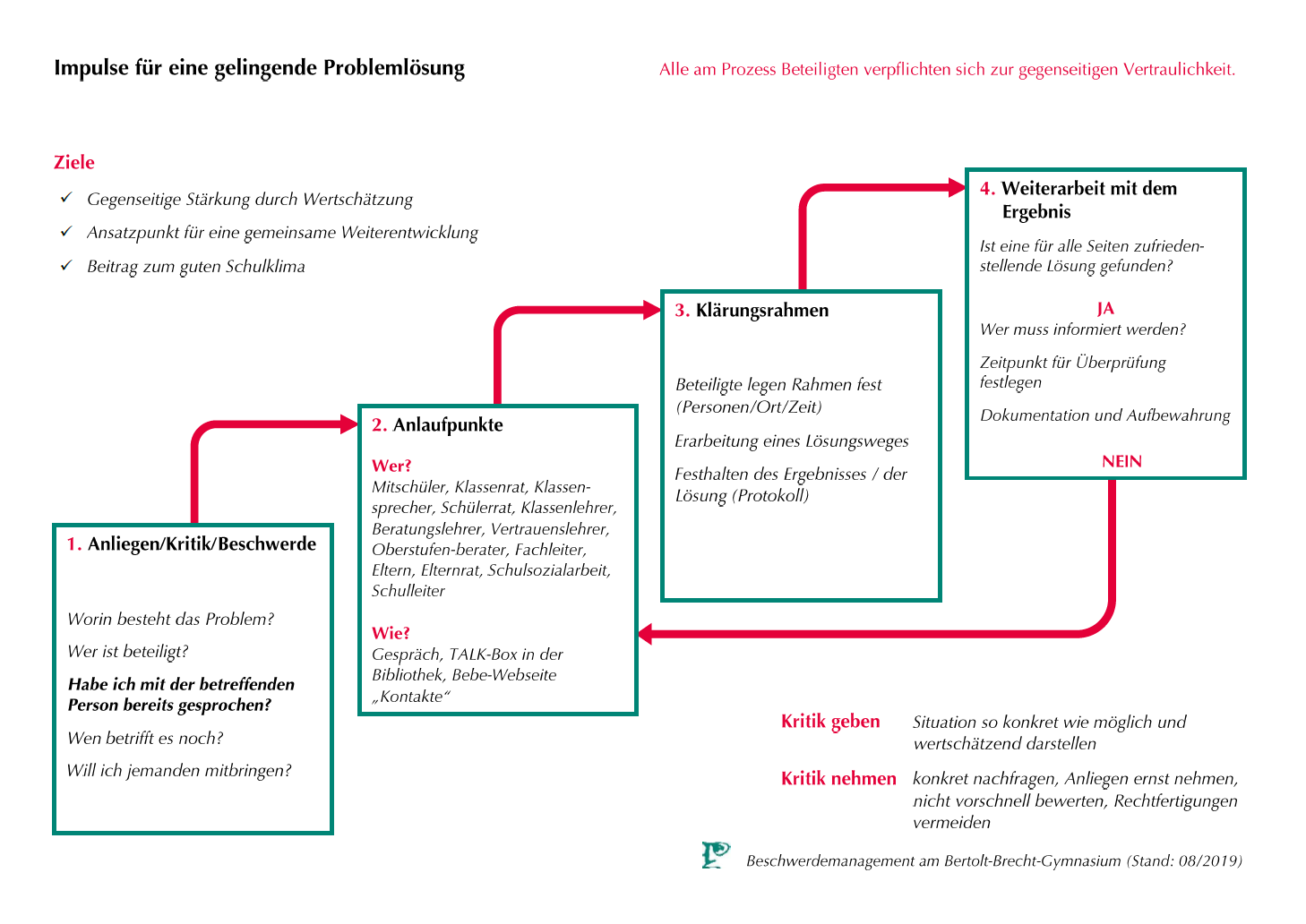 wir freuen uns, Ihnen und Euch eine anschauliche Grafik unseres Beschwerdemanagements präsentieren zu können. In dieser Übersicht werden die Wege ersichtlich, die an unserer Schule gegangen werden können, um eine gelingende Problembearbeitung herbeizuführen. Wir möchten Sie ermutigen, diese Möglichkeit zu ergreifen.